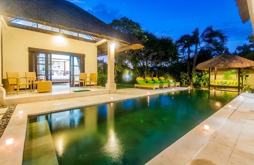 This spacious two-story villa has three bedrooms, a large infinity pool and lush tropical gardens. The villa blends modern comforts with traditional Balinese design. At the end of the gang it is the perfect situation and away from street noise, yet close to the centre of Seminyak. Most things you would want to do on your holiday, eateries, shops, spas and galleries, nightlife and the beach are within easy walking reach.