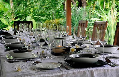 In the front and sides of this luxury villa is a large veranda. The veranda has several beautiful sitting areas that provide a gorgeous view of the majestic mountains and beautiful tropical gardens. The dining area has a large teak-wood dining table (3.5 m), which seats up to ten guests. The light terrazzo floors give the environment a fresh, airy and spacious character. On the terrace are also ceiling fans if cooling is required.